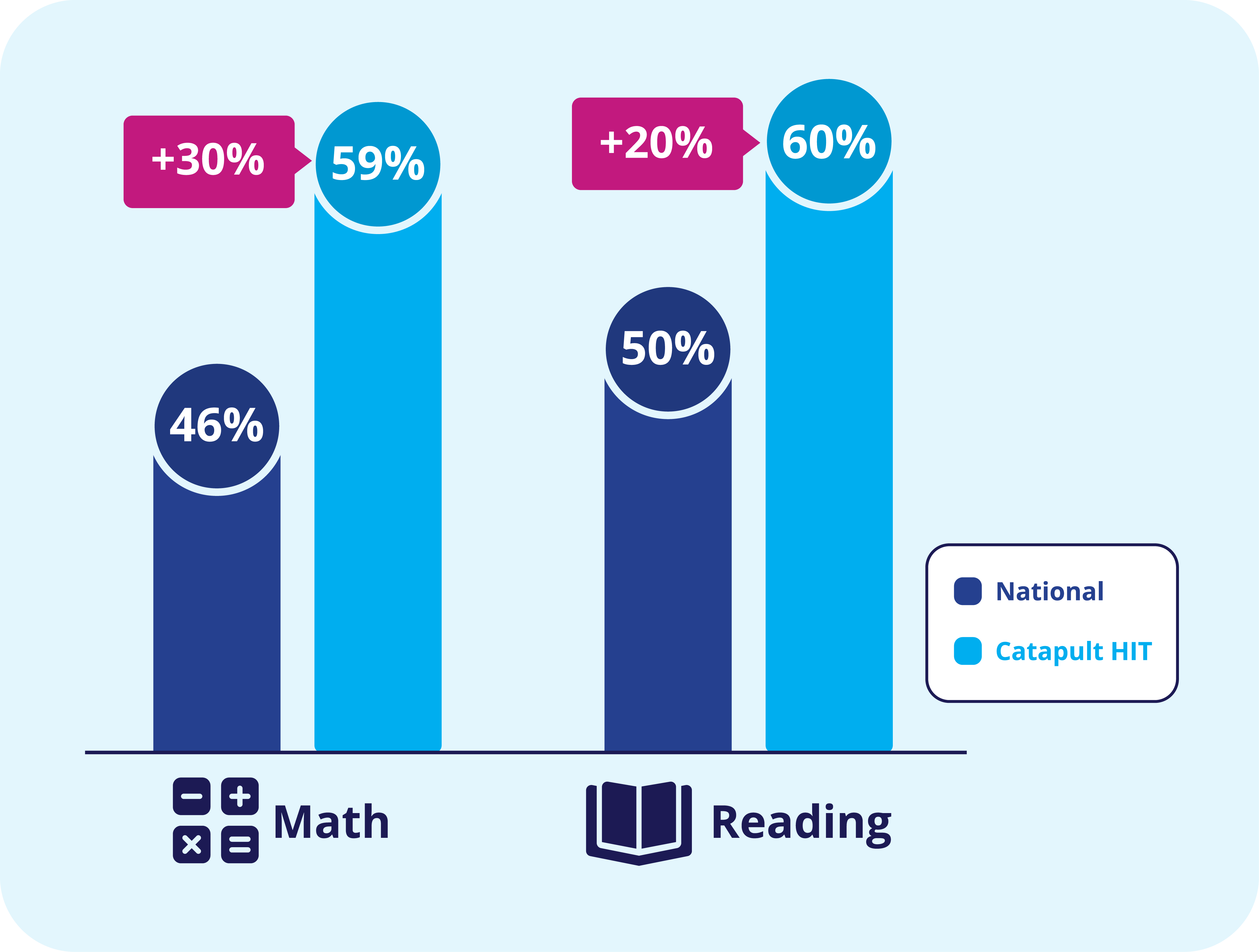 Catapult Learning students who started below the 20th percentile significantly out-performed a national comparison group of Title-1 eligible students with 30% more math students and 20% more reading students hitting growth targets.